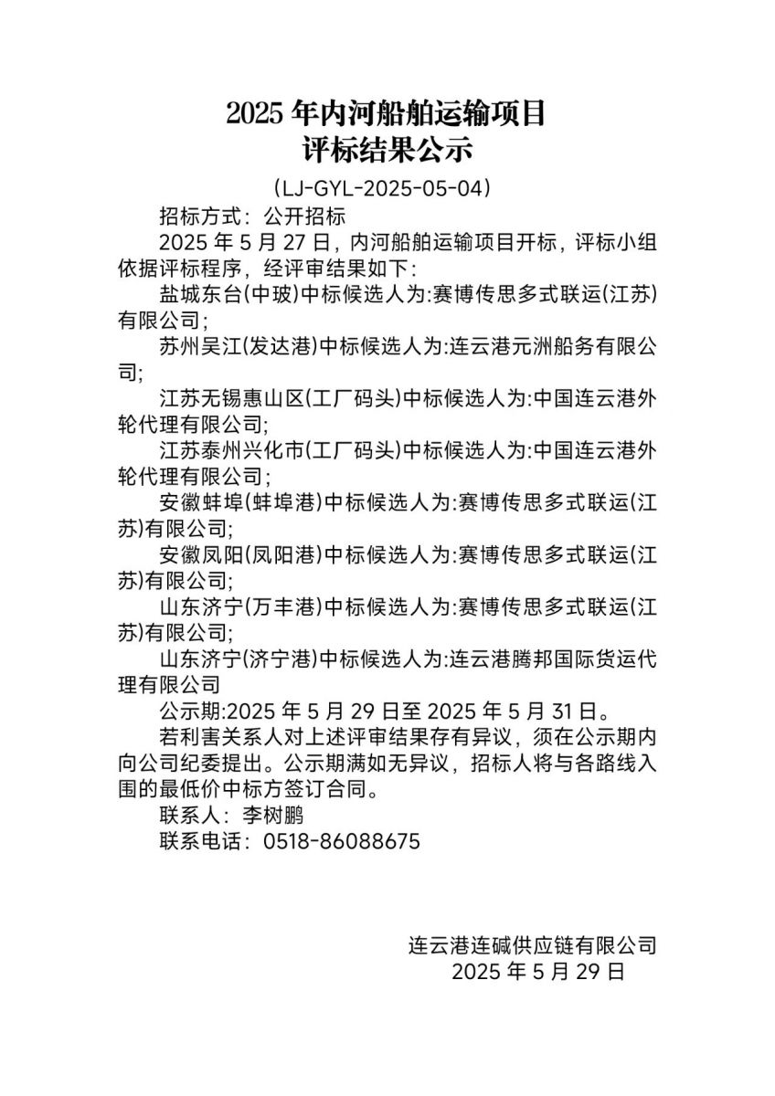 連云港連堿供應(yīng)鏈有限公司2025年內(nèi)河船舶運(yùn)輸項(xiàng)目評(píng)標(biāo)結(jié)果公示