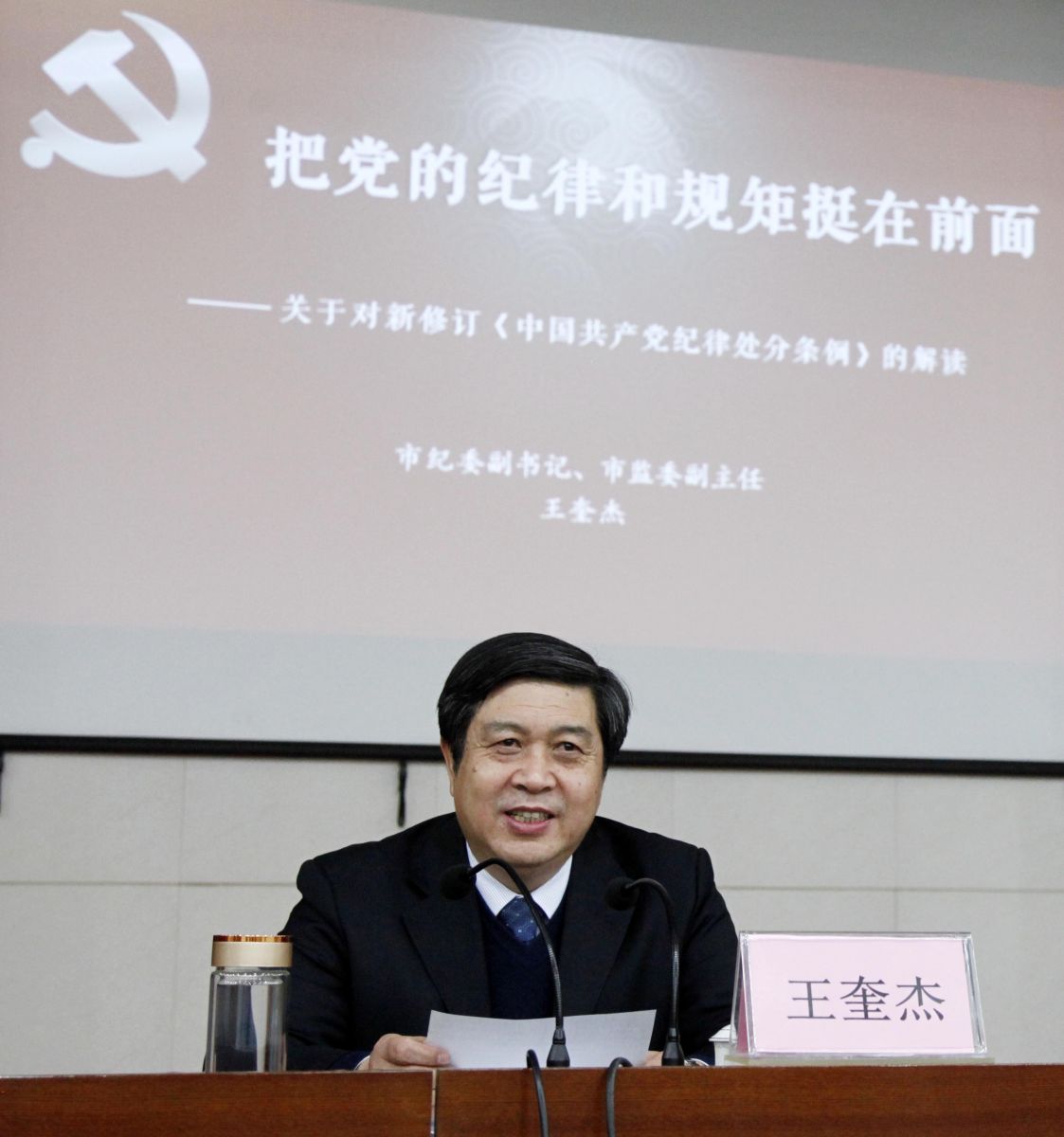 為了讓廣大黨員干部更好地把《中國共產(chǎn)黨紀(jì)律處分條例》學(xué)深悟透、融會貫通,12月21日,公司特邀市紀(jì)委副書記、市監(jiān)委副主任王奎杰對新修訂的《條例》進(jìn)行了專題解讀。市國資委黨委成員王懷東、公司領(lǐng)導(dǎo)、中層干部、關(guān)鍵崗位主管人員共100余人參加了學(xué)習(xí)。