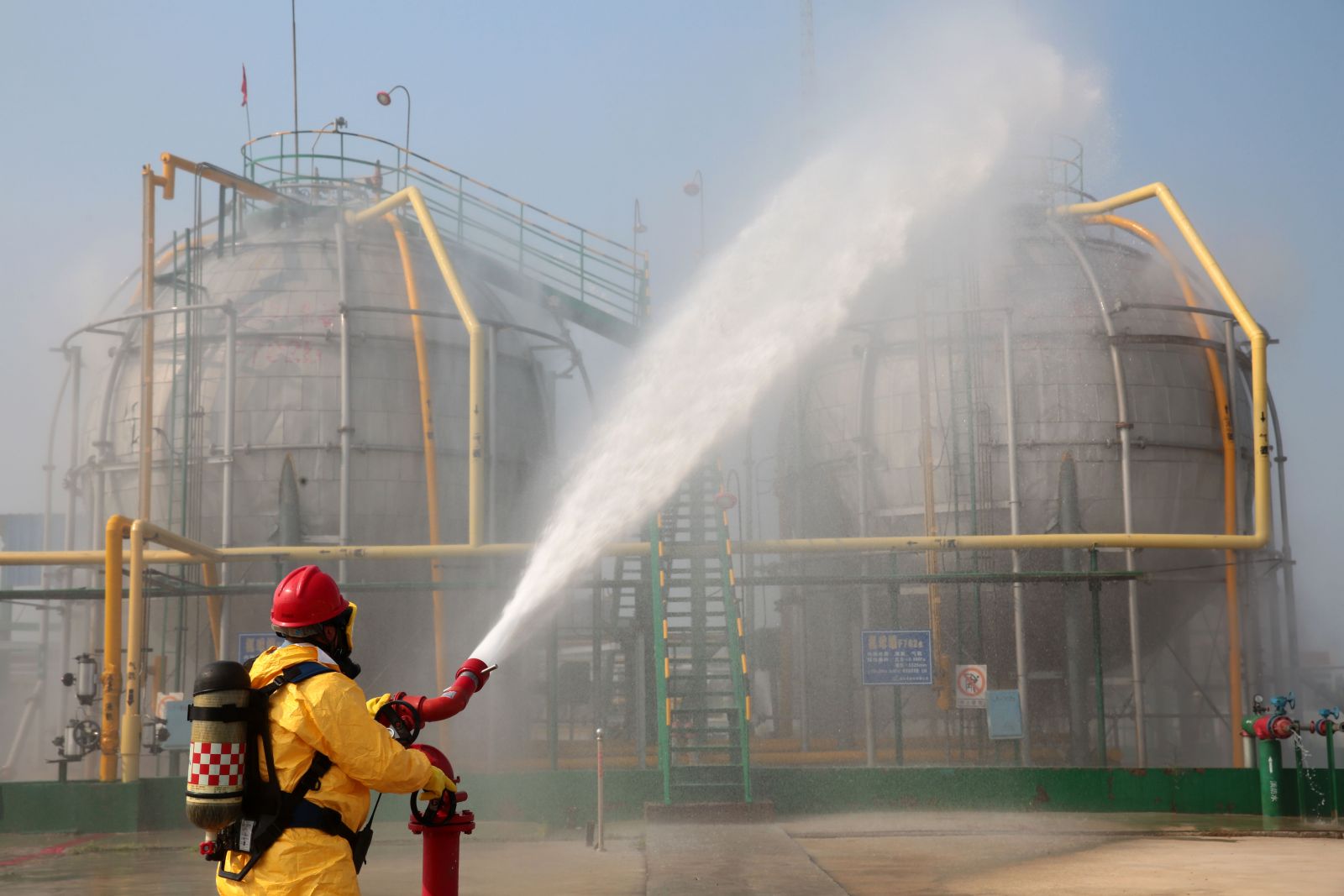 9月5日下午2:30左右,儲(chǔ)運(yùn)車間液氨庫(kù)操作室DCS操作電腦及SIS系統(tǒng)顯示屏上發(fā)出氨氣超標(biāo)報(bào)警聲,當(dāng)班人員通過操作室視頻監(jiān)控發(fā)現(xiàn)氨球罐B罐底部發(fā)生泄漏,大量氨氣外泄,現(xiàn)場(chǎng)白霧彌漫。兩名當(dāng)班人員穿戴好防護(hù)用品現(xiàn)場(chǎng)檢查發(fā)現(xiàn)氨球罐B罐底部?jī)x表導(dǎo)液管截止閥(二次閥)損壞,且有一人中毒受傷躺在B球罐底部下方的地面上,立即進(jìn)行應(yīng)急處理,并向當(dāng)班值班長(zhǎng)匯報(bào),啟動(dòng)班組應(yīng)急預(yù)案;后車間主任接到報(bào)警,啟動(dòng)車間應(yīng)急程序啟動(dòng);接著公司預(yù)案演練現(xiàn)場(chǎng)應(yīng)急救援指揮部總指揮接到報(bào)警,啟動(dòng)公司級(jí)應(yīng)急預(yù)案,調(diào)動(dòng)各應(yīng)急小組進(jìn)行搶險(xiǎn)救援工作。