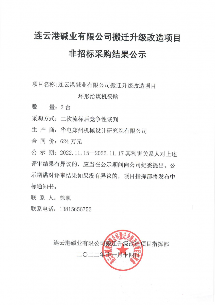 環形給煤機非招標采購結果公示