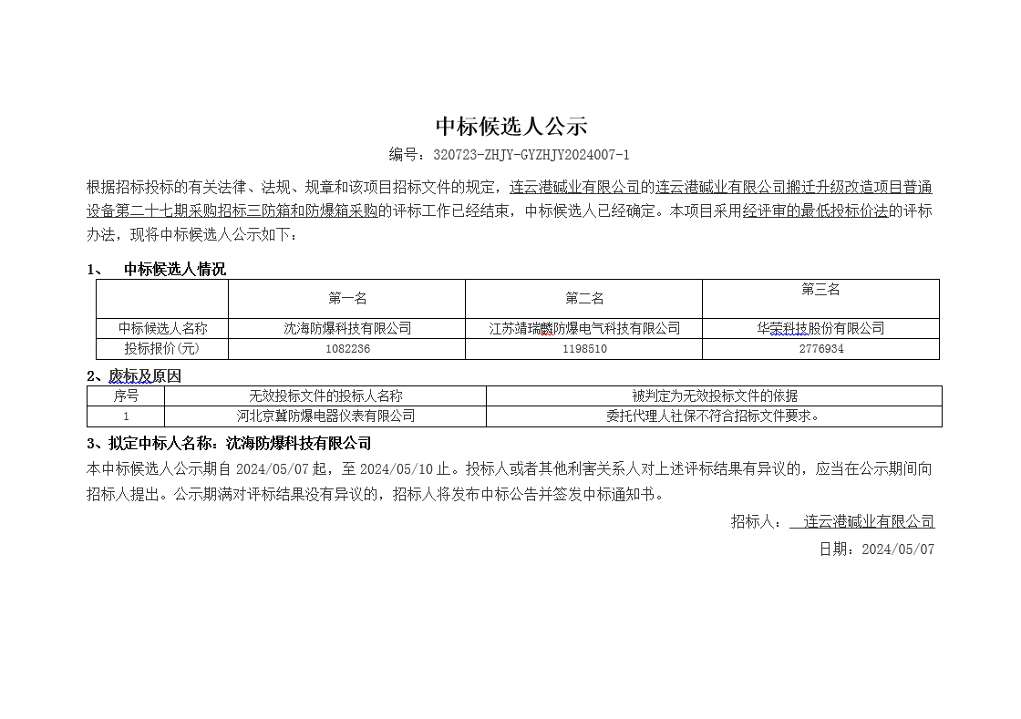 搬遷升級改造項目普通設備第二十七期采購招標三防箱和防爆箱采購中標候選人公示