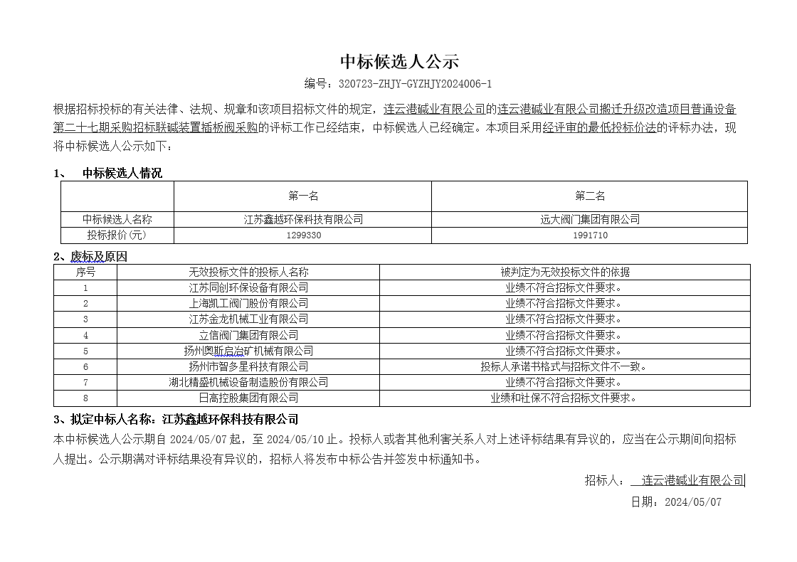 搬遷升級改造項目普通設備第二十七期采購招標聯堿裝置插板閥采購中標候選人公示