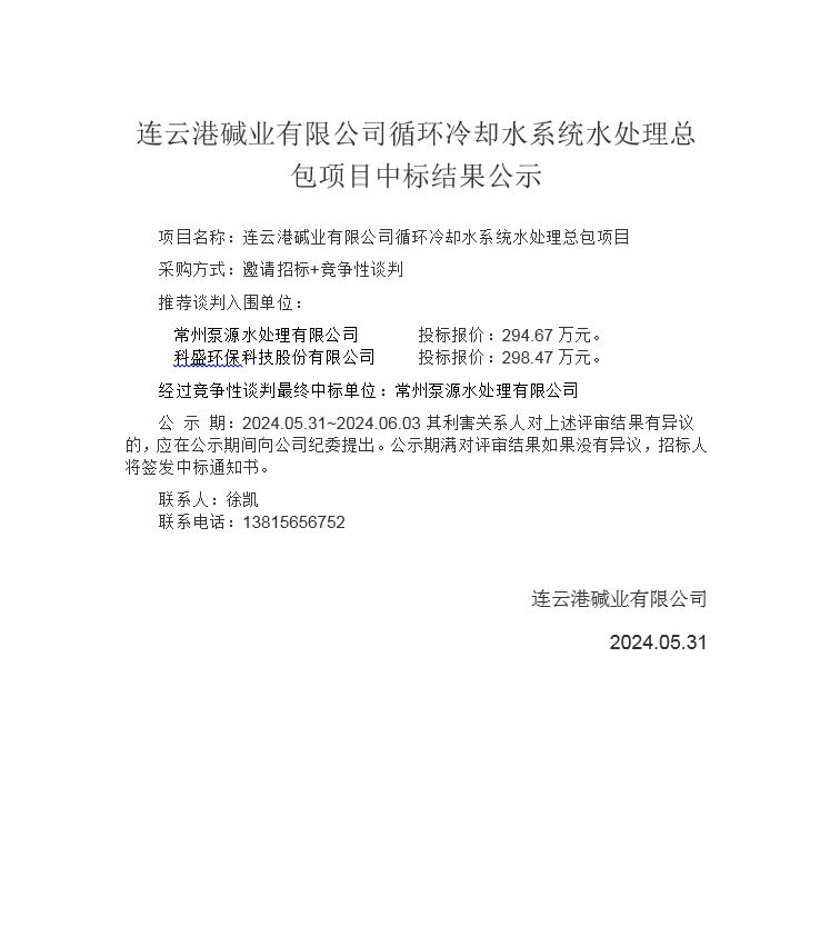 連云港堿業有限公司循環冷卻水系統水處理總包項目中標結果公示
