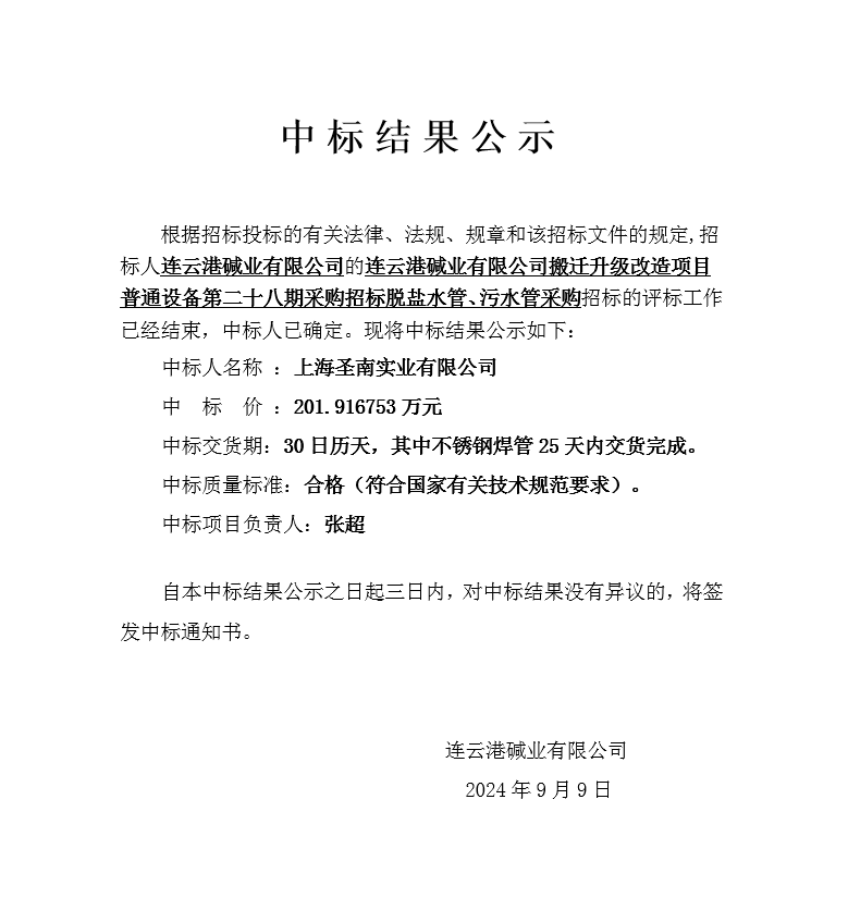 搬遷升級改造項目普通設備第二十八期采購招標脫鹽水管、污水管采購中標結果公示