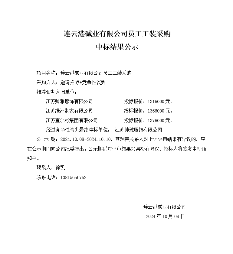 連云港堿業有限公司員工工裝采購中標結果公示