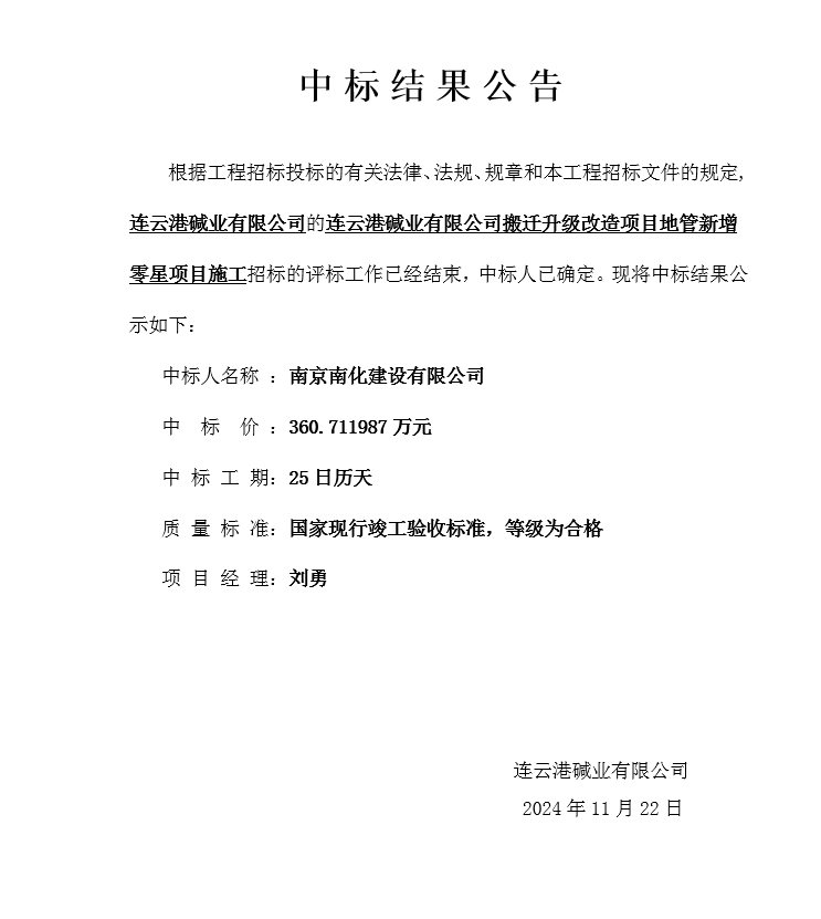 連云港堿業有限公司搬遷升級改造項目地管新增零星項目施工中標結果公告
