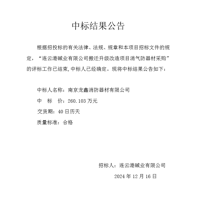 連云港堿業(yè)有限公司搬遷升級(jí)改造項(xiàng)目消氣防器材中標(biāo)結(jié)果公告