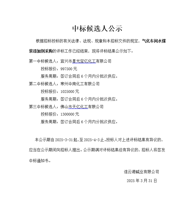 氣化車間水煤漿添加劑采購中標候選人公示